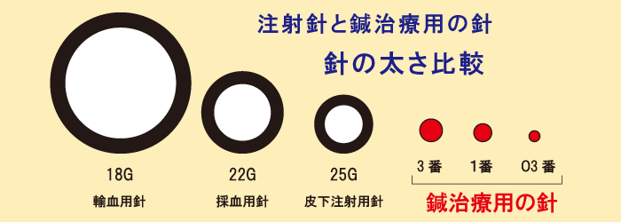 また場合に応じて、(現時点で)最も細い鍼03番鍼〔太さ0.10mm〕から、3番鍼〔太さ0.20mm〕程度の太さの鍼を使い分けています。